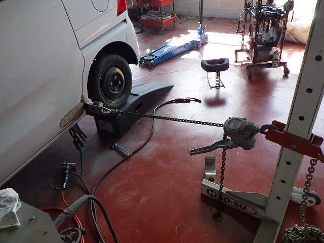 なので鉄板を溶接して・・それをフレーム修正用のクランプで掴み・・それを1.5トンのチェーンブロックで引っ張ります