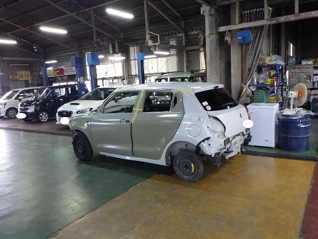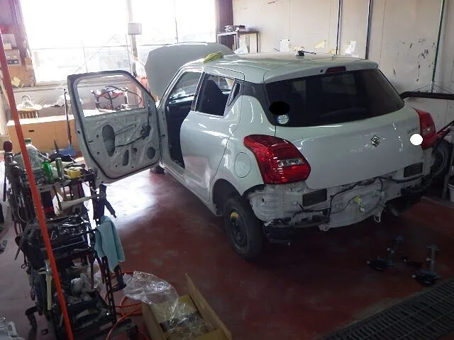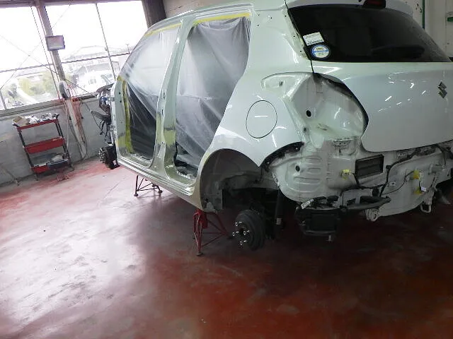 ★スズキ スイフト 左リヤ板金塗装実例 クオーターパテ修理 リアバンパー交換 低隠ぺい性