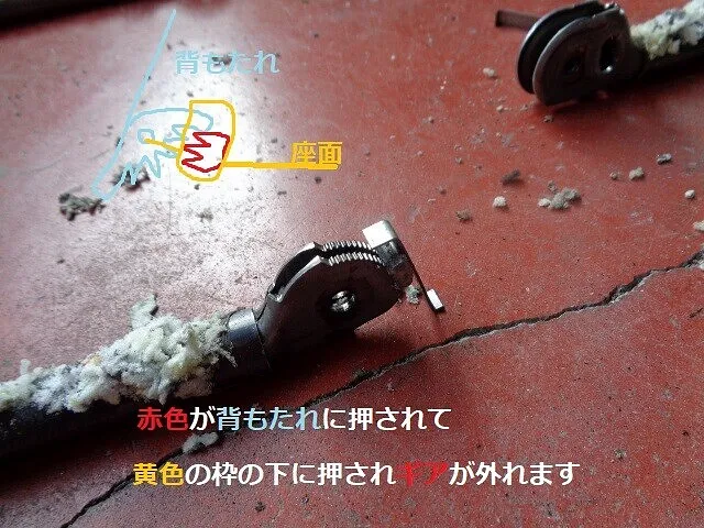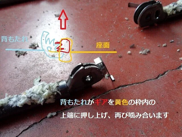 が下がり・・背もたれのギザギザからギアが外れる仕組み