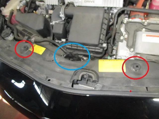 ボンネットの固定は青丸部分でボンネットを引き寄せて、赤丸のゴムで押し返す事でボンネットのガタを防いでます。